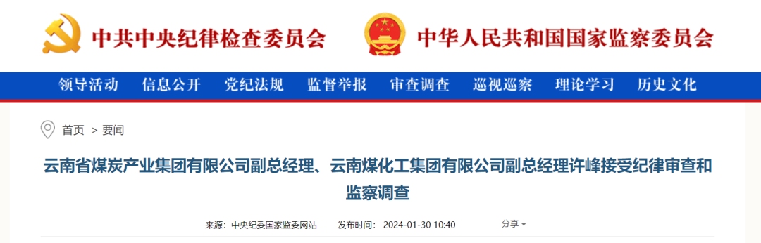 中央紀(jì)委國(guó)家監(jiān)委網(wǎng)站1月30日,據(jù)云南省紀(jì)委監(jiān)委消息:云南省煤炭產(chǎn)業(yè)集團(tuán)有限公司副總經(jīng)理、云南煤化工集團(tuán)有限公司副總經(jīng)理許峰涉嫌嚴(yán)重違紀(jì)違法,主動(dòng)投案,目前正接受云南省紀(jì)委監(jiān)委紀(jì)律審查和監(jiān)察調(diào)查。