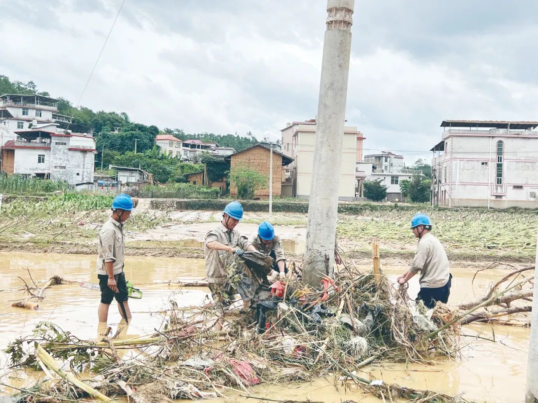 ▲圖為6月17日,國(guó)網(wǎng)福建永定區(qū)供電公司支援搶修隊(duì)伍對(duì)上杭縣10千伏稔洪線電桿傾斜現(xiàn)場(chǎng)開(kāi)展搶修工作。黃小芬/攝