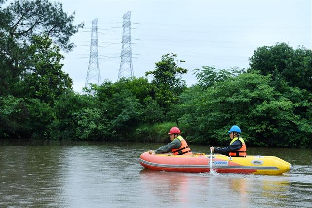 國(guó)網(wǎng)浙江金華供電公司員工利用皮劃艇對(duì)池塘溪澗附近10千伏線路開(kāi)展防汛隱患排查。