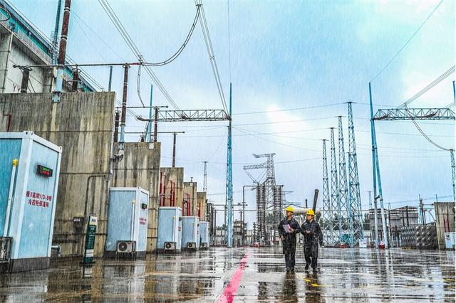 國(guó)網(wǎng)河南直流中心運(yùn)維人員在±800千伏特高壓中州換流站開(kāi)展暴雨天氣特巡。