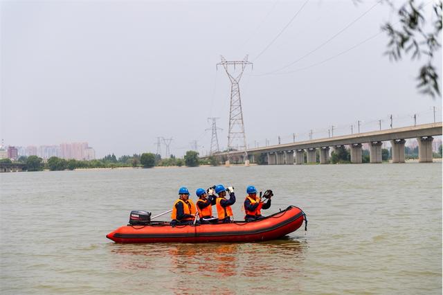 國(guó)網(wǎng)吉林四平供電公司員工乘充氣艇對(duì)處于濕地的鐵塔開(kāi)展防汛特巡。