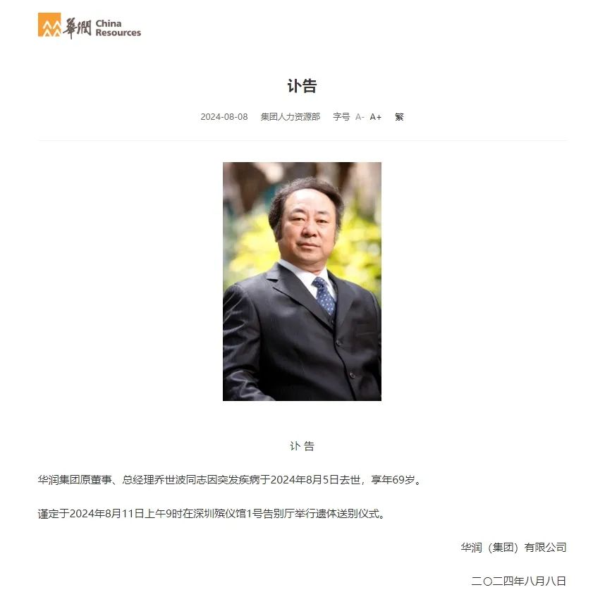 2024年8月5日,華潤集團原董事、總經(jīng)理喬世波因突發(fā)疾病去世,享年69歲。其遺體送別儀式定于8月11日上午9時在深圳殯儀館1號告別廳舉行。