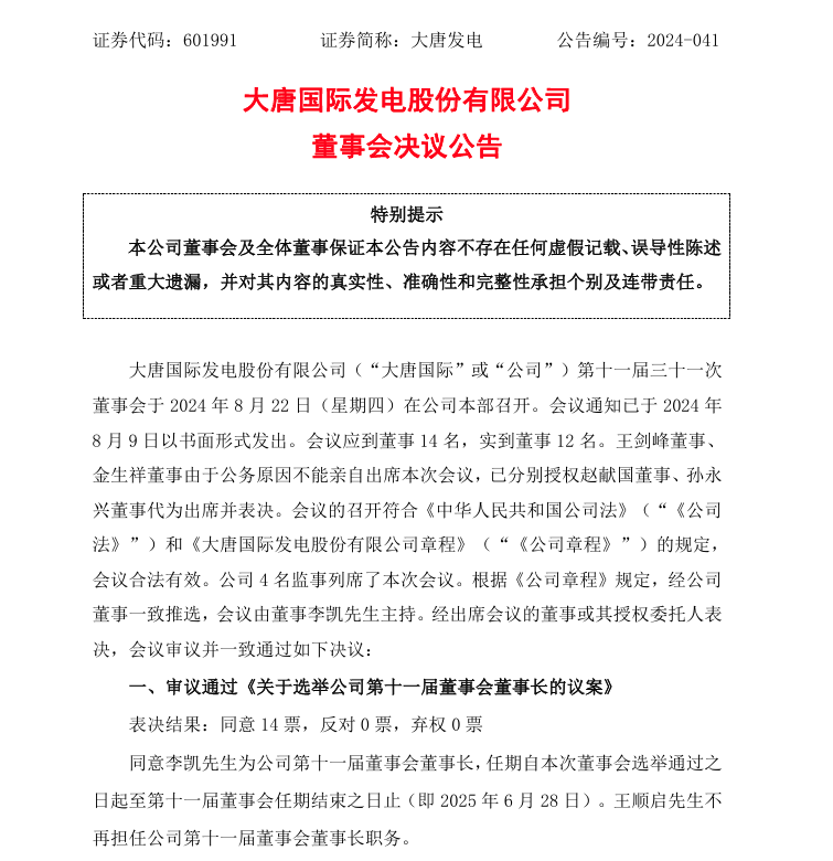 8月23日,大唐發(fā)電公告稱,董事會審議通過《關(guān)于選舉公司第十一屆董事會董事長的議案》,同意李凱先生為公司第十一屆董事會董事長,任期自本次董事會選舉通過之 日起至第十一屆董事會任期結(jié)束之日止(即2025年6月28日)。王順啟先生不再擔任公司第十一屆董事會董事長職務。