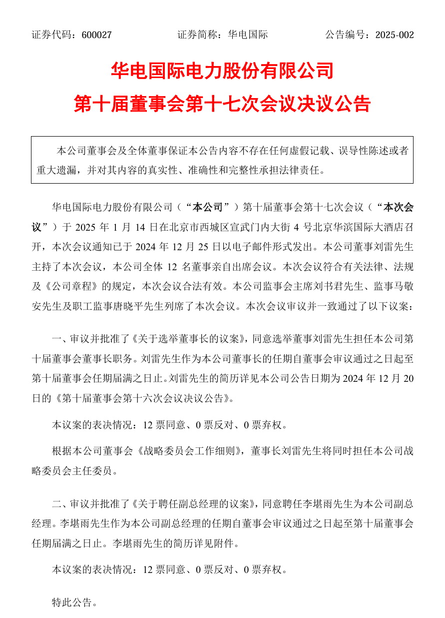 華電國際發(fā)布公告稱,公司第十屆董事會第十七次會議于1月14日召開。會議審議并批準(zhǔn)了《關(guān)于選舉董事長的議案》,同意選舉董事劉雷先生擔(dān)任本公司第十屆董事會董事長職務(wù)。劉雷先生作為本公司董事長的任期自董事會審議通過之日起至第十屆董事會任期屆滿之日止。