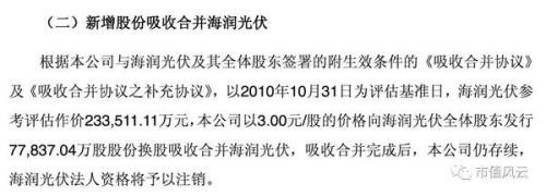 根據(jù)報告書,原海潤光伏2008年、2009年和2010年1~10月實現(xiàn)的凈利潤分別為2.11億、0.26億(據(jù)說是受金融危機影響)、2.7億,妥妥的優(yōu)質(zhì)資產(chǎn)。