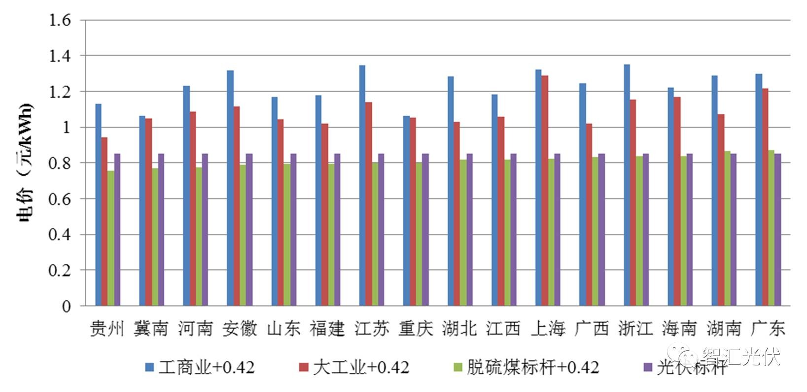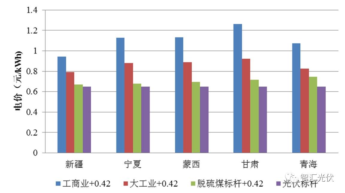 可以看出: “工商業(yè)+0.42”比0.65元/kWh高0.29~0.61元/kWh “大工業(yè)+0.42”比0.65元/kWh高0.14~0.27元/kWh 脫硫煤+0.42”比0.65元/kWh高0.02~0.095元/kWh 即在Ⅰ 類資源區(qū),無論是在工商業(yè)屋頂,還是大工業(yè)屋頂,“自發(fā)自用電價”、“余電上網(wǎng)電價“均高于當(dāng)?shù)氐摹叭~上網(wǎng)”標(biāo)桿電價0.65元/kWh。