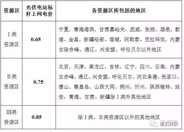 全國分為三類電價區(qū),光伏標(biāo)桿電價分別為0.65元/kWh、0.75元/kWh、0.85元/kWh。