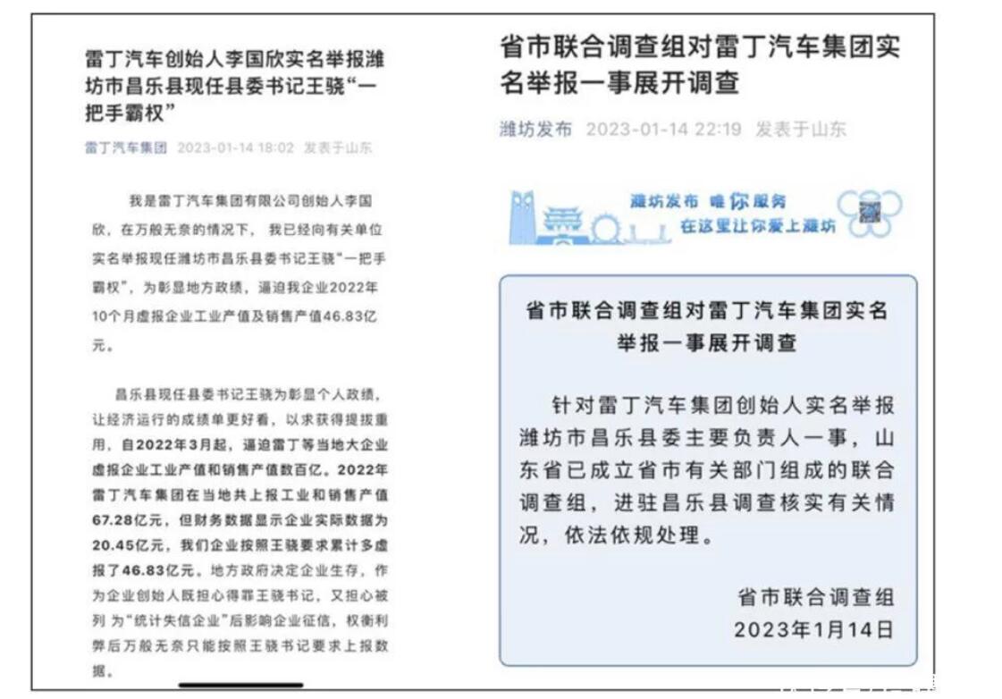 1月14日小年夜,一篇題為《雷丁汽車創(chuàng)始人李國欣實名舉報濰坊市昌樂縣現任縣委書記王驍“一把手霸權”》的文章在各大社交平臺“刷屏”,該篇文章由“雷丁汽車集團”微信公眾號發(fā)布。同時,雷丁汽車創(chuàng)始人李國欣在雷丁汽車視頻號發(fā)布了一則時長約一分鐘的視頻,稱“昌樂縣現任縣委書記王驍逼迫公司提報虛假統(tǒng)計數據近50億元”。