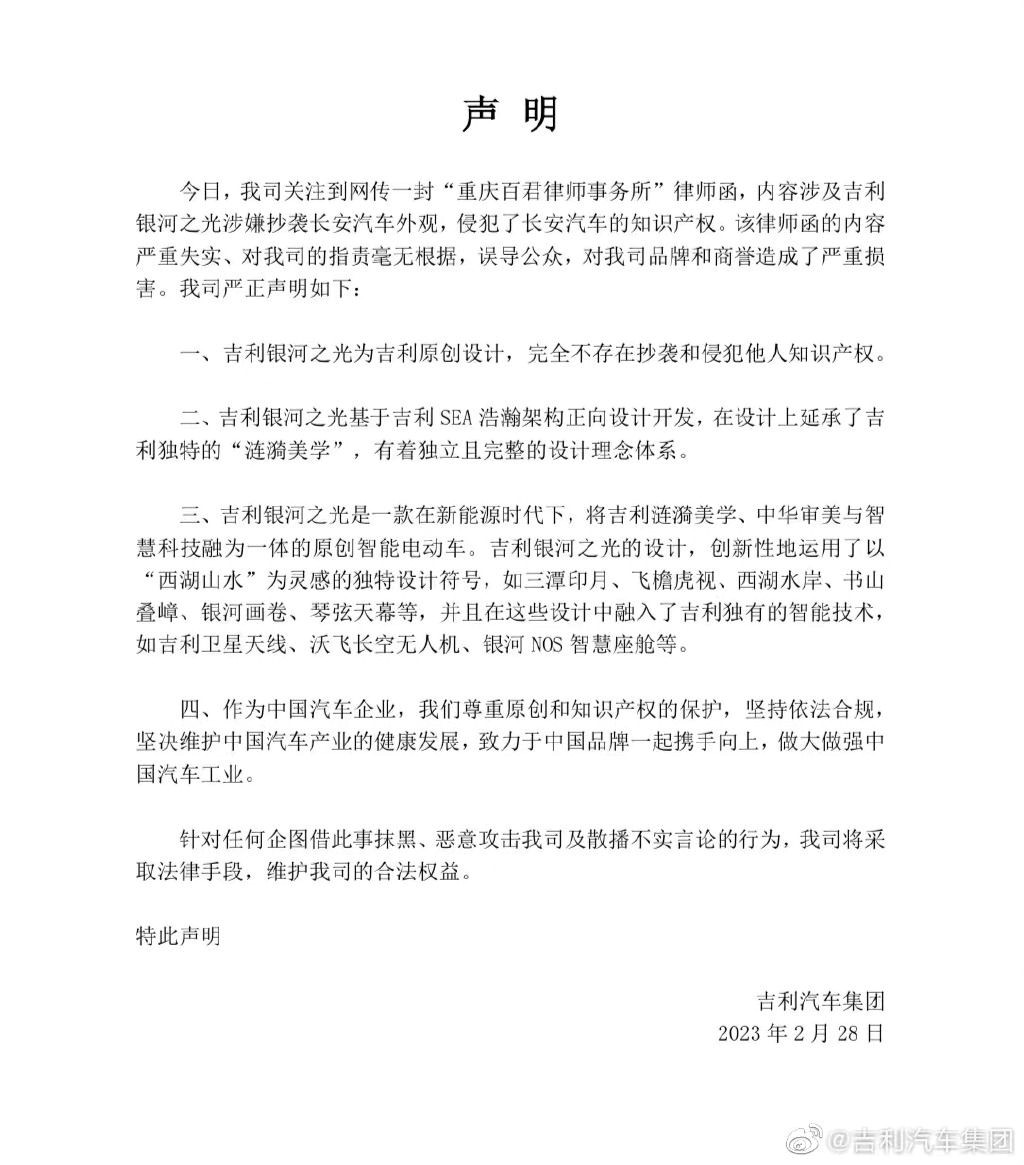 針對抄襲傳聞,吉利汽車直斥上述律師函“內(nèi)容嚴(yán)重失實、指責(zé)毫無根據(jù),誤導(dǎo)公眾,對我司品牌和商譽造成了嚴(yán)重損害。”根據(jù)吉利汽車2月28日發(fā)布的聲明,吉利銀河之光為吉利原創(chuàng)設(shè)計,完全不存在抄襲和侵犯他人知識產(chǎn)權(quán)。