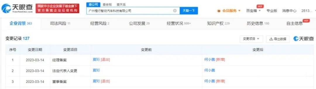根據(jù)天眼查App顯示,近日,廣州橙行智動(dòng)汽車科技有限公司發(fā)生工商變更,夏珩卸任法定代表人、執(zhí)行董事、經(jīng)理,由何小鵬接任。不久前,夏珩已接連卸任廣東小鵬汽車科技有限公司、廣州小鵬汽車科技有限公司職務(wù),并均由何小鵬接任。