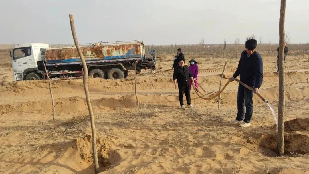 (靈武市自然資源局專業(yè)技術(shù)人員指導(dǎo)苗木保護(hù),馬家灘鎮(zhèn)工作人員對(duì)苗木進(jìn)行澆灌)