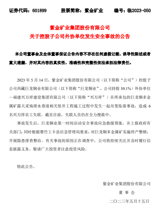 5月14日,紫金礦業(yè)集團股份有限公司控股子公司西藏巨龍銅業(yè)有限公司(以下簡稱“巨龍銅業(yè)”)外協(xié)單位福建興萬祥建設集團有限公司(以下簡稱“興萬祥”)在所承包的巨龍銅多金屬礦露天采場排水巷道相關(guān)豎井工程施工過程中發(fā)生一起吊籠墜落事故,造成6名興萬祥員工失聯(lián)。截至目前,失聯(lián)人員仍在全力搜救中。
