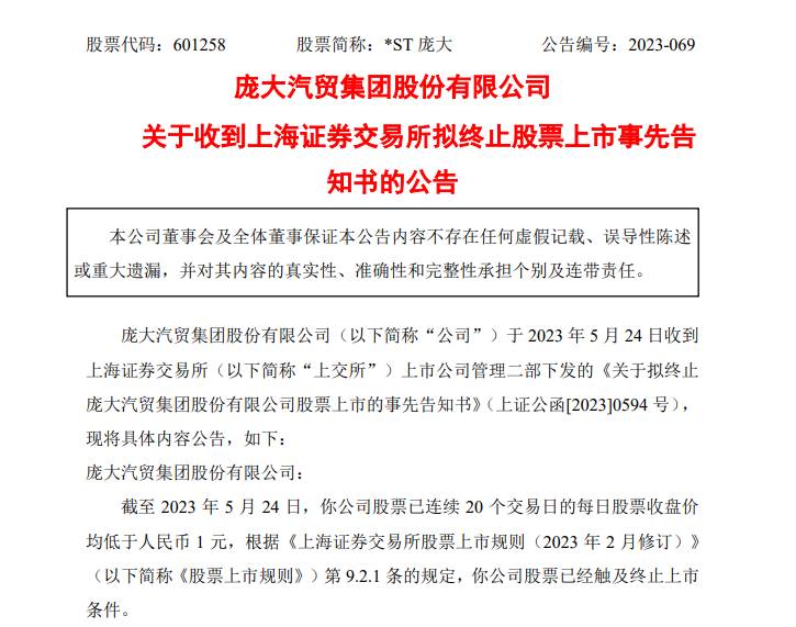 《告知書》顯示,截至2023年5月24日,龐大集團股票收盤價已連續(xù)20個交易日低于人民幣1元,根據(jù)《上海證券交易所股票上市規(guī)則(2023年2月修訂)》規(guī)定,龐大集團股票已經(jīng)觸及終止上市條件,上交所依據(jù)相關規(guī)定對龐大集團股票作出終止上市的決定。