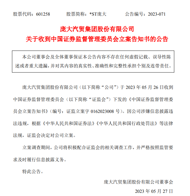 5月26日,*ST龐大再發(fā)公告稱,公司于5月26日收到中國證券監(jiān)督管理委員會(以下簡稱證監(jiān)會)下發(fā)的《中國證券監(jiān)督管理委員會立案告知書》。因公司涉嫌信息披露違法違規(guī),根據(jù)相關法律法規(guī),證監(jiān)會決定對公司立案。立案調(diào)查期間,公司將積極配合證監(jiān)會的相關調(diào)查工作,并嚴格按照監(jiān)管要求及時履行信息披露義務。