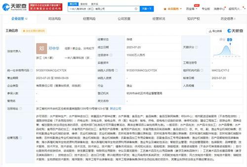 天眼查App顯示,一米八海洋科技(浙江)有限公司的法定代表人為鄧中華,注冊資本1.1億人民幣,經(jīng)營范圍包括水產(chǎn)養(yǎng)殖、食品銷售、水產(chǎn)品冷凍加工、輸電供電、海上風電相關(guān)系統(tǒng)研發(fā)、儲能技術(shù)服務等。