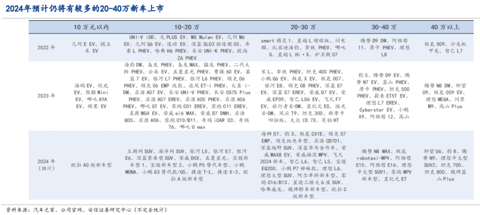 安信證券研究中心發(fā)布的研究報告認(rèn)為,新能源車高端化仍有較大的空間。在40萬元以上的市場中,新能源汽車滲透率相對較低,相關(guān)數(shù)據(jù)顯示,2023年1-10月僅為17.5%,與40萬以下市場相比,新能源滲透率仍有較大的提升空間。安信證券研究中心預(yù)測,2024年高端新能源車銷量及占比有望持續(xù)提升,在多款全新高端車型上市的催化下,2024年20萬-30萬元、30萬-40萬、40萬元以上新能源車銷售占比將達28.4%、11.4%及6%,新能源車行業(yè)結(jié)構(gòu)有望進一步高端化。
