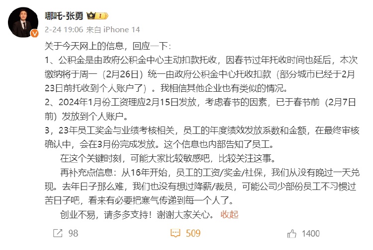 澎湃新聞注意到,春節(jié)復工后,多位員工在脈脈平臺爆料稱,此前哪吒汽車的CEO張勇承諾年后上班第一周發(fā)放年終獎卻并未兌現(xiàn),人事部門經(jīng)理在群內通知稱,年終獎延遲到3月發(fā)放。該事經(jīng)發(fā)酵后,張勇在個人微博進行了回應。