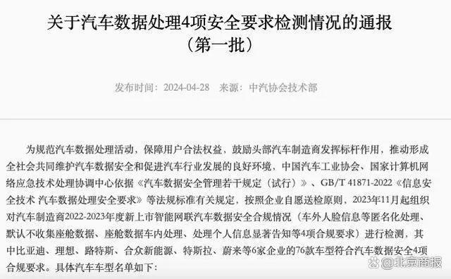 4月28日,中汽協(xié)官方發(fā)布《關(guān)于汽車數(shù)據(jù)處理4項(xiàng)安全要求檢測(cè)情況的通報(bào)(第一批)》,其中,比亞迪、理想、路特斯、合眾新能源(哪吒汽車)、特斯拉、蔚來(lái)6家企業(yè)的76款車型符合汽車數(shù)據(jù)安全4項(xiàng)合規(guī)要求。