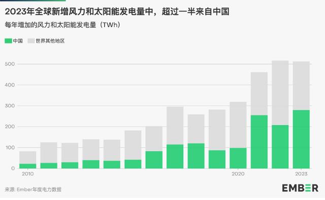 Ember高級(jí)電力政策分析師楊木易告訴澎湃新聞(www.thepaper.cn),目前,大部分風(fēng)光發(fā)電集中在中國(guó)和發(fā)達(dá)經(jīng)濟(jì)體。特別值得一提的是,中國(guó)在2023年對(duì)全球風(fēng)電和太陽(yáng)能發(fā)電增長(zhǎng)作出了巨大的貢獻(xiàn)。其新增太陽(yáng)能發(fā)電占全球總量的51%,新增風(fēng)能占比更是達(dá)到60%。未來幾年中國(guó)的太陽(yáng)能和風(fēng)能容量以及電力發(fā)電量增長(zhǎng)將保持較高水平。