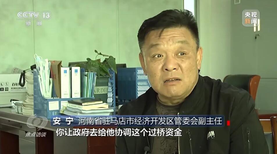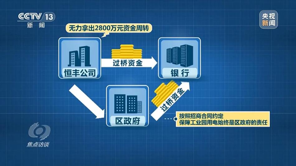 河南省駐馬店市經(jīng)濟(jì)開(kāi)發(fā)區(qū)管委會(huì)副主任安寧:過(guò)橋資金2800萬(wàn),他自己拿不起,讓政府協(xié)調(diào)過(guò)橋資金,政府又為了免于擔(dān)風(fēng)險(xiǎn),幾經(jīng)努力,最后這個(gè)事沒(méi)有做成。說(shuō)是為了免擔(dān)風(fēng)險(xiǎn),區(qū)政府沒(méi)有幫助協(xié)調(diào)下過(guò)橋資金,但是,也沒(méi)有履行確保恒豐公司用電負(fù)荷的約定。當(dāng)?shù)亟o產(chǎn)業(yè)園提供的一直是建設(shè)廠房時(shí)的臨時(shí)用電,220千伏變電站沒(méi)有如期建成,對(duì)企業(yè)造成的影響,當(dāng)?shù)卣质侨绾慰创哪?河南省駐馬店市經(jīng)濟(jì)開(kāi)發(fā)區(qū)管委會(huì)副主任安寧:電力接上了,是臨時(shí)用電,建設(shè)期都給接了。記者:電力保障在前,還是應(yīng)該生產(chǎn)在前?河南省駐馬店市經(jīng)濟(jì)開(kāi)發(fā)區(qū)管委會(huì)副主任安寧:電力保障在前。記者:正式用電的電力保障一直沒(méi)有進(jìn)行的原因是什么呢?河南省駐馬店市經(jīng)濟(jì)開(kāi)發(fā)區(qū)管委會(huì)副主任安寧:這個(gè)你要問(wèn)當(dāng)事人。