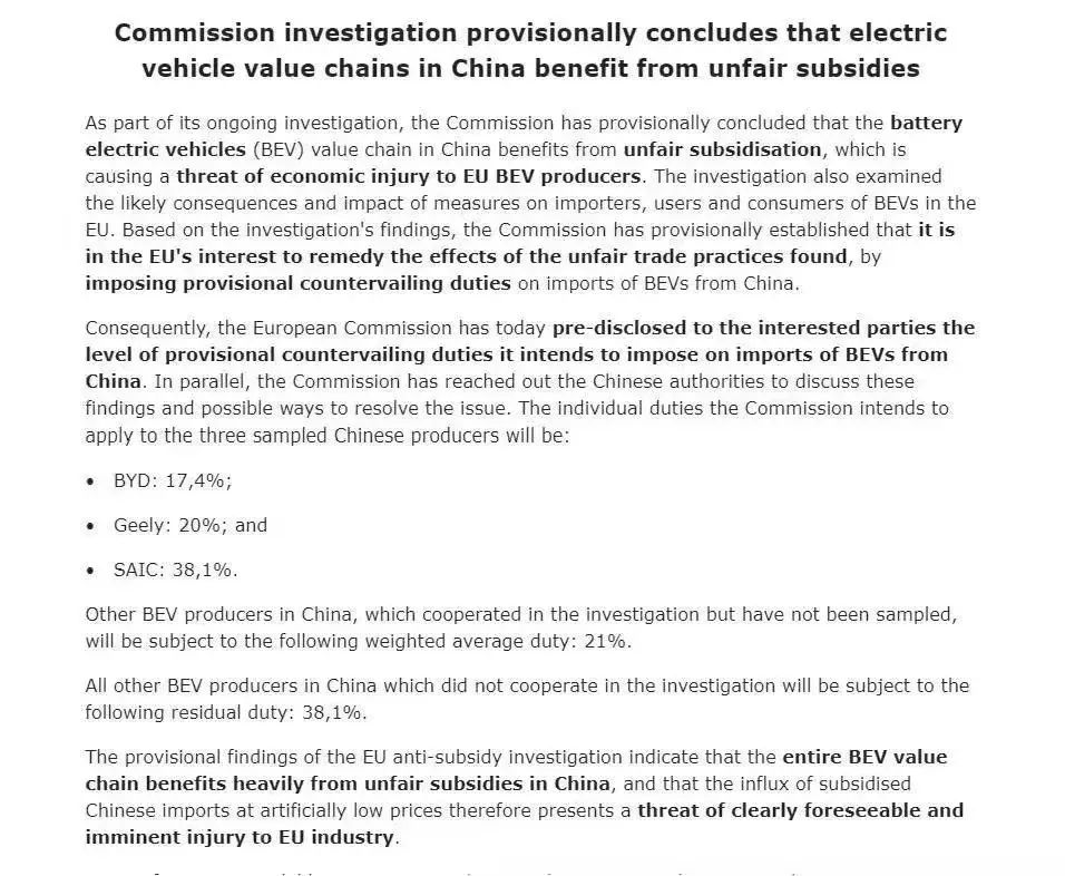 6月12日,歐盟委員會(huì)發(fā)布公告稱,如無(wú)法與中方達(dá)成解決方案,針對(duì)從中國(guó)進(jìn)口的電動(dòng)汽車(chē)征收臨時(shí)反補(bǔ)貼稅的方案將于7月4日起實(shí)施。歐盟委員會(huì)表示,對(duì)抽樣的三家企業(yè)——比亞迪、吉利汽車(chē)和上汽集團(tuán),將分別加征17.4%、20%和38.1%的反補(bǔ)貼稅;對(duì)參與調(diào)查但未被抽樣的電動(dòng)汽車(chē)制造商平均加征21%的反補(bǔ)貼稅;未配合調(diào)查的電動(dòng)汽車(chē)制造商將被加征38.1%的反補(bǔ)貼稅。