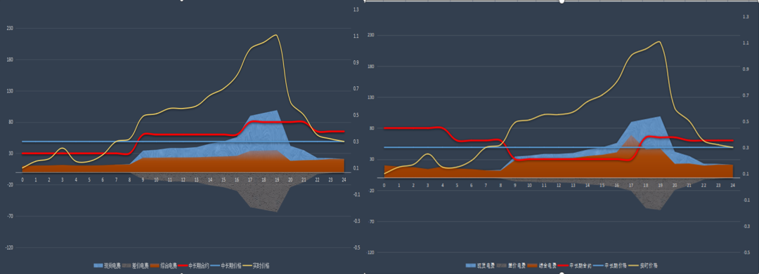 當(dāng)市場來臨的時候,部分國有發(fā)電企業(yè)的經(jīng)營模式并沒有調(diào)整到位,可能存在經(jīng)營決策失誤的原因。例如,中長期簽約時未充分考慮自身節(jié)點(diǎn)和用戶側(cè)現(xiàn)貨價格的差異,不同發(fā)電企業(yè)、不同用戶一個策略,簡單粗暴,不管簽?zāi)牡挠脩舳际且粋€價,只重視合同價格的高低,不考慮價差電費(fèi)的高低,有些甚至不在合同中約定分時價格。如圖4所示,左圖與右圖用戶電量相同,左圖用戶合同價為0.4元/度,右圖用戶合同價為0.3元/度,兩個用戶用電曲線形狀不同,其他均相同。從大烏海區(qū)域部分電源的選擇來看,顯然更喜歡左圖用戶,然而事實卻告訴我們:由于右圖用戶價差電費(fèi)要遠(yuǎn)高于左圖用戶的價差電費(fèi),最終的結(jié)算結(jié)果是合同價低25%的右圖用戶可以為電源帶來的電費(fèi)(紅色部分)高于左圖用戶。