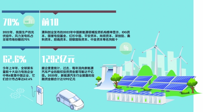 以上并非謬贊。據(jù)國家能源局及咨詢機(jī)構(gòu)SNE Research統(tǒng)計數(shù)據(jù)來看,我國生產(chǎn)的光伏組件、風(fēng)力發(fā)電機(jī)占全球市場份額的70%,新能源汽車動力電池裝車量占世界的60%。在新能源領(lǐng)域,我國擔(dān)當(dāng)?shù)闷?ldquo;領(lǐng)先”之稱。