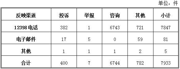按反映渠道分類,12398電話7847件,電子郵件81件,其他5件。(2018年5月收到有效信息情況見表一)