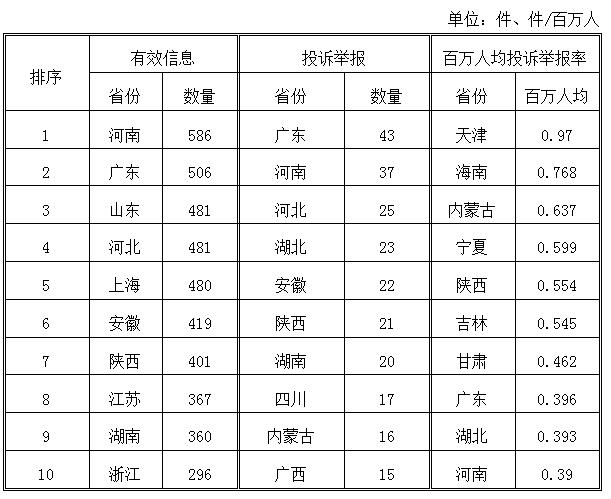 2018年5月,各?。ㄗ灾螀^(qū)、直轄市)按照有效信息數(shù)量排序,河南、廣東、山東、河北等省列全國前10位;按照投訴舉報(bào)數(shù)量排序,廣東、河南、河北等省排在全國前10位;按照百萬人均投訴舉報(bào)率排序,天津、海南、內(nèi)蒙古等?。ㄊ?、自治區(qū))位于全國前10位。(2018年5月有效信息及投訴舉報(bào)排名前10位情況見表三)