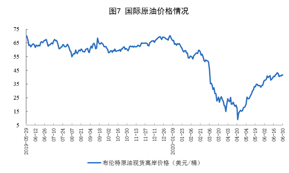 原油進口快速增長,國際原油價格大幅回升。6月份,進口原油5318萬噸,同比增長34.4%。上半年,進口原油2.69億噸,同比增長9.9%,比一季度加快4.9個百分點。6月30日布倫特原油現(xiàn)貨離岸價格為41.64美元/桶,比5月29日的34.15美元/桶回升21.9%。