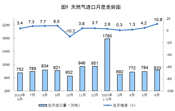 天然氣進口增長明顯加快。6月份,進口天然氣833萬噸,同比增長10.8%,增速比上月加快6.6個百分點。上半年,進口天然氣4836萬噸,同比增長3.3%,比一季度加快1.5個百分點。