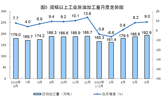 原油生產(chǎn)略有增長,加工量有所加快。6月份,生產(chǎn)原油1624萬噸,同比增長0.7%,增速比上月回落0.6個百分點;加工原油5787萬噸,增長9.0%,比上月加快0.8個百分點。上半年,生產(chǎn)原油9715萬噸,同比增長1.7%,比一季度放緩0.7個百分點;加工原油3.2億噸,同比增長0.6%,一季度為下降4.6%。