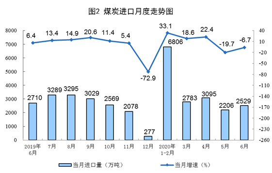煤炭進口下降。6月份,進口煤炭2529萬噸,環(huán)比增加323萬噸,同比下降6.7%;上半年,進口煤炭1.74億噸,同比增長12.7%,比一季度回落15.7個百分點。