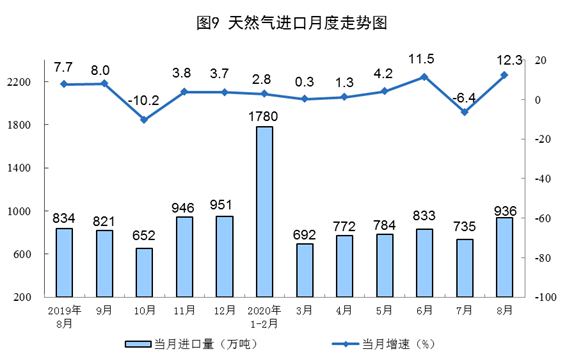 天然氣進(jìn)口增速由負(fù)轉(zhuǎn)正。8月份,進(jìn)口天然氣936萬(wàn)噸,同比增長(zhǎng)12.3%,上月為下降6.4%。1—8月份,進(jìn)口天然氣6507萬(wàn)噸,同比增長(zhǎng)3.3%。