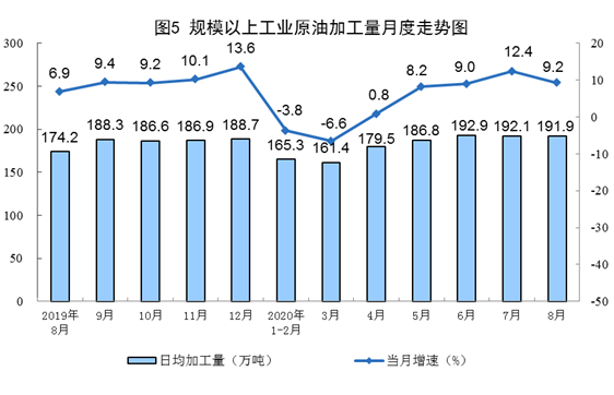 原油生產(chǎn)加快,加工有所放緩。8月份,生產(chǎn)原油1665萬(wàn)噸,同比增長(zhǎng)2.3%,增速比上月加快1.7個(gè)百分點(diǎn);加工原油5947萬(wàn)噸,增長(zhǎng)9.2%,比上月放緩3.2個(gè)百分點(diǎn)。1—8月份,生產(chǎn)原油13015萬(wàn)噸,同比增長(zhǎng)1.5%;加工原油4.4億噸,同比增長(zhǎng)3.2%。