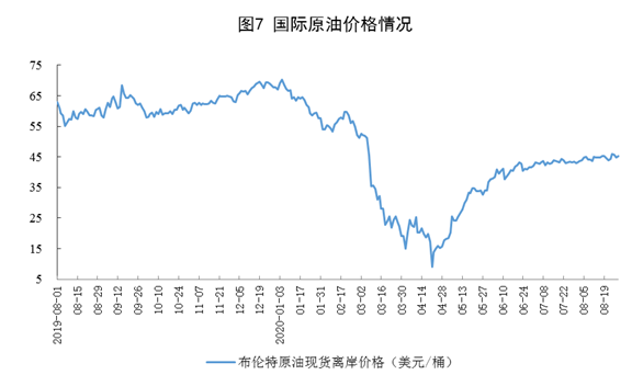 原油進(jìn)口增速回落,國(guó)際原油價(jià)格小幅上漲。8月份,進(jìn)口原油4748萬(wàn)噸,同比增長(zhǎng)12.6%,增速比上月回落12.4個(gè)百分點(diǎn)。1—8月份,進(jìn)口原油3.7億噸,同比增長(zhǎng)12.1%。8月28日布倫特原油現(xiàn)貨離岸價(jià)格為45.22美元/桶,比7月31日的43.13美元/桶上漲4.8%。