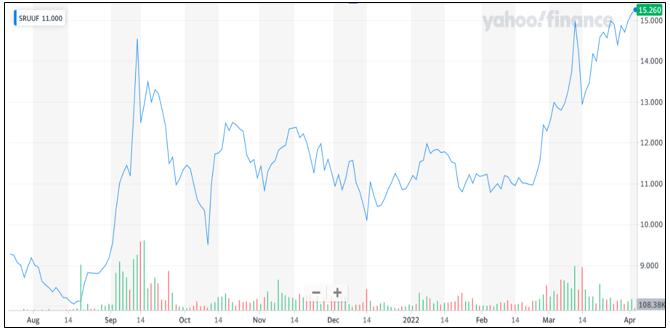 加拿大鈾投資基金斯普羅特(SPUT)股價(jià)表現(xiàn)(2021.8-2022.3)