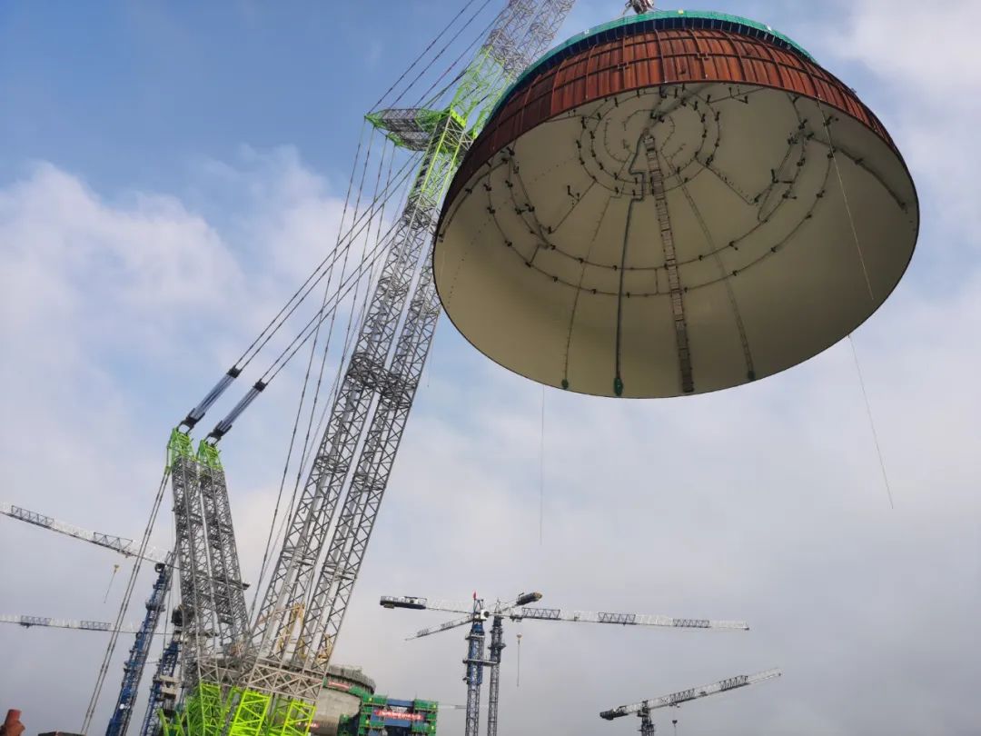 內(nèi)穹頂?shù)跹b是華龍一號(hào)核電工程建設(shè)的重要里程碑。穹頂位于核島頂部,主要功能是保證反應(yīng)堆廠房完整性和密封性,對放射性包容起關(guān)鍵性作用。吊裝當(dāng)天,隨著總指揮一聲令下,內(nèi)穹頂被緩緩吊離地面,經(jīng)過起鉤、變幅、提升、帶載行走、大臂逆時(shí)針回轉(zhuǎn)等一系列高精度動(dòng)作,精準(zhǔn)直達(dá)漳州核電2號(hào)機(jī)組反應(yīng)堆廠房上方,隨后緩慢下降,經(jīng)調(diào)整無誤后,平穩(wěn)落鉤就位在安全殼鋼襯里上。