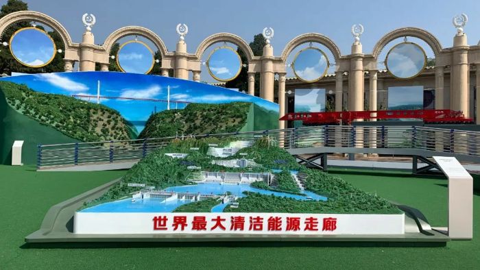 沙盤(pán)模型展示了長(zhǎng)江干流烏東德、白鶴灘、溪洛渡、向家壩、三峽、葛洲壩6座梯級(jí)水電站樞紐建筑物及配套設(shè)施,逼真再現(xiàn)了由這6座梯級(jí)電站構(gòu)成的世界最大清潔能源走廊的恢弘氣勢(shì)與格局,向觀眾呈現(xiàn)了新中國(guó)水電事業(yè)從自立更生、創(chuàng)新發(fā)展到領(lǐng)跑世界的奮斗歷程,并融入新能源和長(zhǎng)江大保護(hù)等元素,展示了三峽集團(tuán)奮力實(shí)施清潔能源和長(zhǎng)江生態(tài)環(huán)保“兩翼齊飛”發(fā)展愿景。