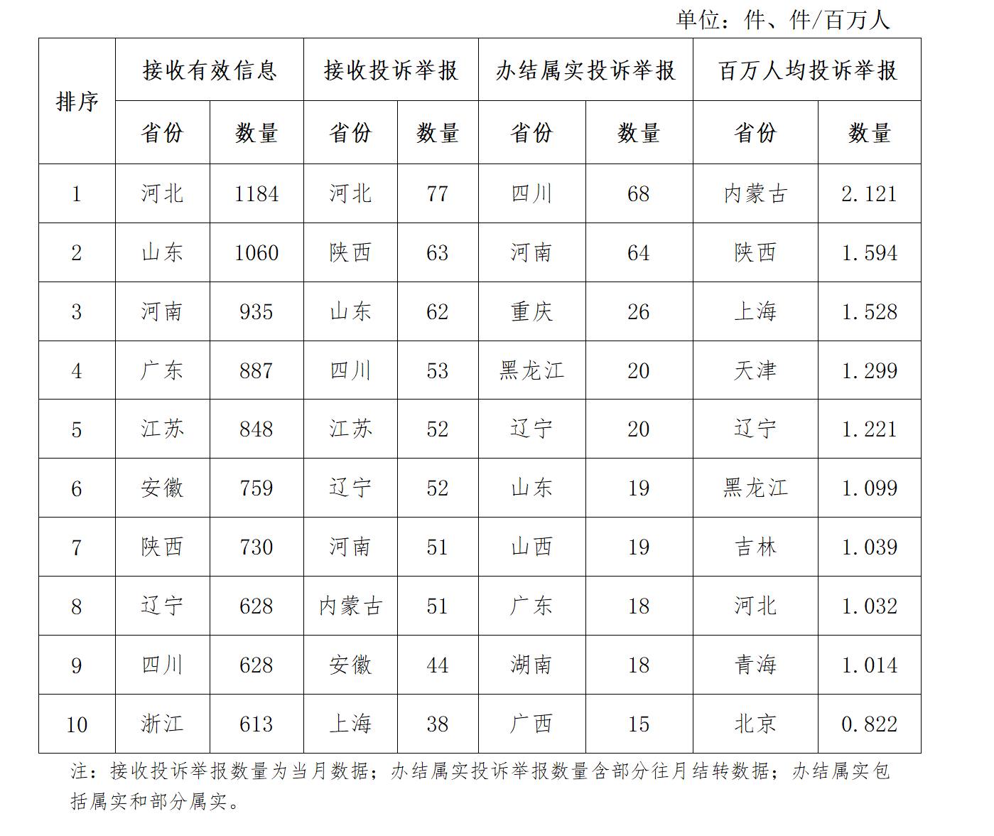 各省(自治區(qū)、直轄市)按照接收的有效信息數(shù)量排序,河北、山東、河南、廣東、江蘇、安徽、陜西、遼寧、四川、浙江排在全國(guó)前10位;按照接收的投訴舉報(bào)數(shù)量排序,河北、陜西、山東、四川、江蘇、遼寧、河南、內(nèi)蒙古、安徽、上海排在全國(guó)前10位;按照辦結(jié)屬實(shí)的投訴舉報(bào)數(shù)量排序,四川、河南、重慶、黑龍江、遼寧、山東、山西、廣東、湖南、廣西排在全國(guó)前10位;按照百萬(wàn)人均投訴舉報(bào)數(shù)量排序,內(nèi)蒙古、陜西、上海、天津、遼寧、黑龍江、吉林、河北、青海、北京排在全國(guó)前10位。(2022年9月有效信息及投訴舉報(bào)排名前10位情況見表三)