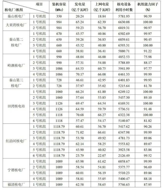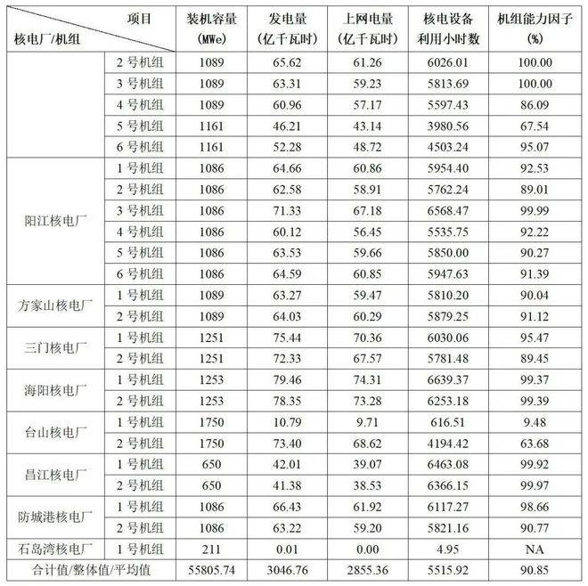 3)本表“合計(jì)值/整體值/平均值”中,裝機(jī)容量、發(fā)電量、上網(wǎng)電量為各機(jī)組合計(jì)值,核電設(shè)備利用小時(shí)數(shù)為全部機(jī)組整體值,機(jī)組能力因子為全部機(jī)組的算數(shù)平均值。