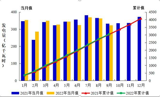 圖2:2021年1月至2022年9月全國(guó)運(yùn)行核電機(jī)組發(fā)電量趨勢(shì)