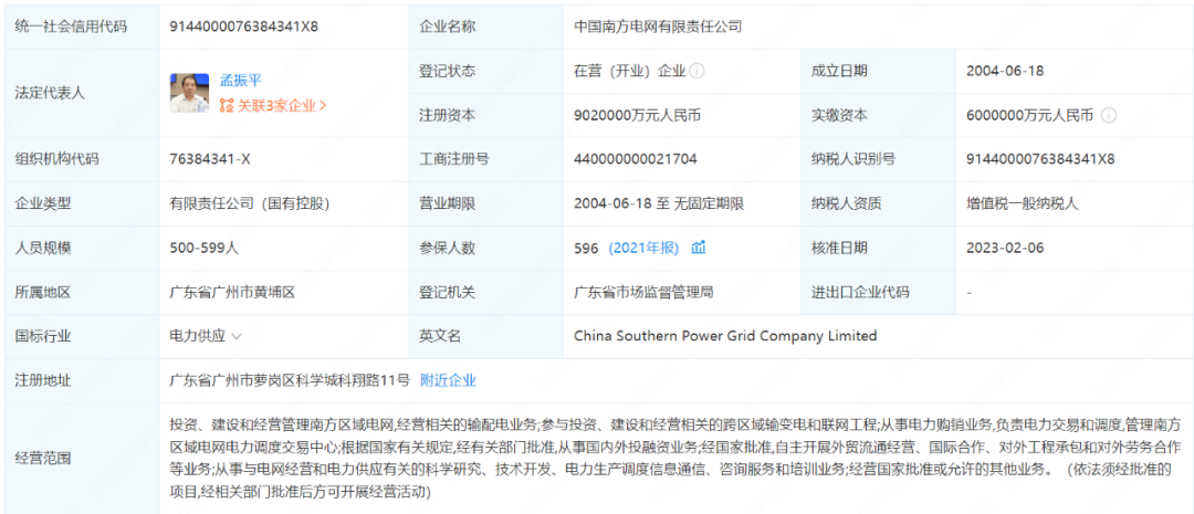 2月6日,中國南方電網(wǎng)有限責任公司發(fā)生工商變更。