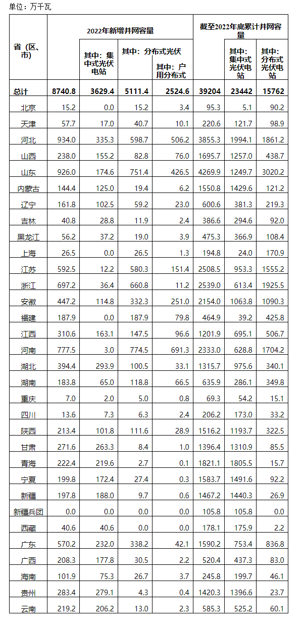 3.2022年部分省(自治區(qū)、直轄市)裝機(jī)有退運(yùn)減容,截至2022年底累計并網(wǎng)容量按當(dāng)年凈增并網(wǎng)容量統(tǒng)計。