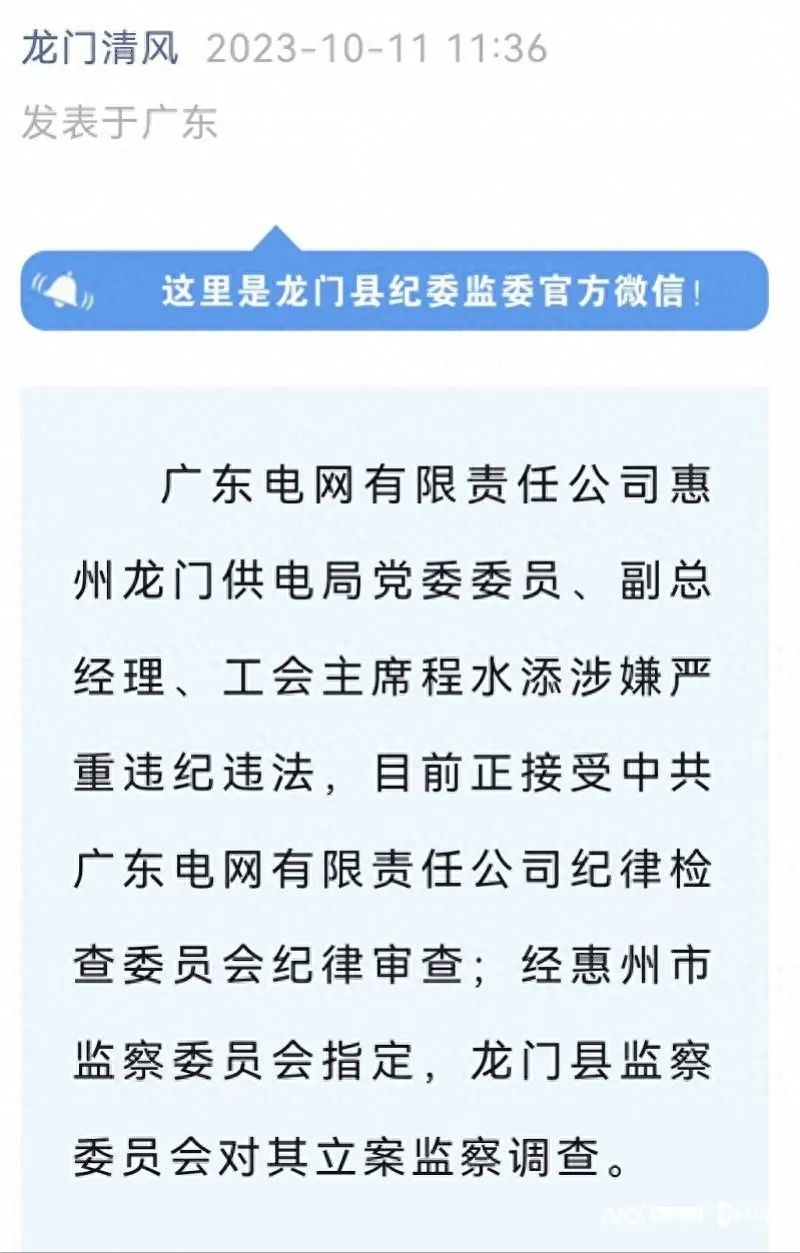 廣東電網(wǎng)有限責(zé)任公司惠州龍門供電局黨委委員、副總經(jīng)理、工會(huì)主席程水添涉嫌嚴(yán)重違紀(jì)違法,目前正接受中共廣東電網(wǎng)有限責(zé)任公司紀(jì)律檢查委員會(huì)紀(jì)律審查,經(jīng)惠州市監(jiān)察委員會(huì)指定,龍門縣監(jiān)察委員會(huì)對(duì)其立案監(jiān)察調(diào)查。