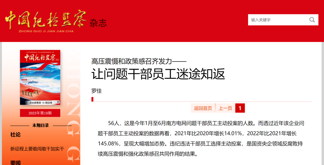 最新一期《中國紀(jì)檢監(jiān)察》雜志刊發(fā)了《高壓震懾和政策感召齊發(fā)力—— 讓問題干部員工迷途知返》一文,文中透露,今年1月至6月,南方電網(wǎng)共有56名問題干部員工主動(dòng)“投案”。