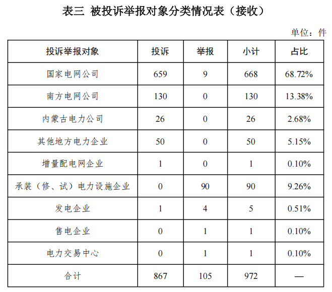 從被投訴舉報(bào)對(duì)象看,供電企業(yè)719件、占投訴舉報(bào)總數(shù)的89.99%,其中國(guó)家電網(wǎng)公司545件、占比68.21%,南方電網(wǎng)公司117件、占比14.64%,內(nèi)蒙古電力公司20件、占比2.50%,其他地方電力企業(yè)44件、占比5.51%,增量配電企業(yè)3件、占比0.37%;承裝(修、試)電力設(shè)施企業(yè)67件、占比8.39%;發(fā)電企業(yè)2件、占比0.25%;電力交易機(jī)構(gòu)1件、占比0.13%。