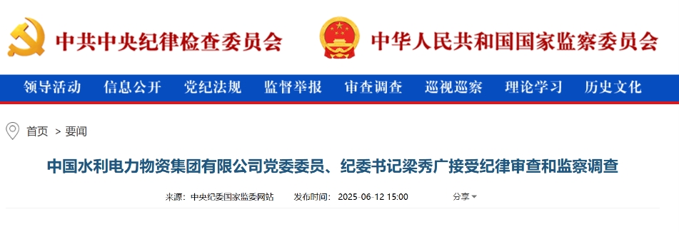 中央紀(jì)委國(guó)家監(jiān)委網(wǎng)站6月12日消息,據(jù)中央紀(jì)委國(guó)家監(jiān)委駐中國(guó)大唐紀(jì)檢監(jiān)察組、江蘇省紀(jì)委監(jiān)委消息:中國(guó)水利電力物資集團(tuán)有限公司黨委委員、紀(jì)委書記梁秀廣涉嫌嚴(yán)重違紀(jì)違法,目前正接受中央紀(jì)委國(guó)家監(jiān)委駐中國(guó)大唐紀(jì)檢監(jiān)察組紀(jì)律審查和江蘇省鎮(zhèn)江市監(jiān)察委員會(huì)監(jiān)察調(diào)查。