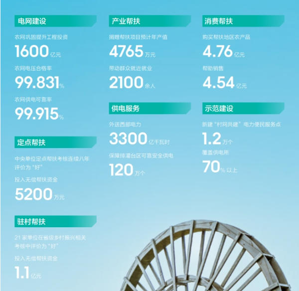 農(nóng)網(wǎng)鞏固提升工程投資1600億元,農(nóng)網(wǎng)電壓合格率99.831%,農(nóng)網(wǎng)供電可靠率99.915%;捐贈幫扶項目預計年產(chǎn)值4765萬元,帶動群眾就近就業(yè)2100余人;投入無償幫扶資金1.1億元。