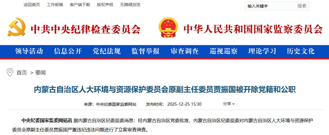 2025年12月,賈振國(guó)嚴(yán)重違紀(jì)違法被開(kāi)除黨籍和公職。